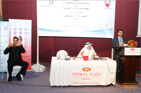 أبدى عدد من المشاركين من ذوي الاحتياجات الخاصة "فئة الصم" سعادتهم بالمشاركة في ندوة "الوعي الانتخابي" التي نظمها معهد البحرين للتنمية السياسية مساء يوم الاربعاء الماضي، وقدمها الباحث ورئيس قسم الدراسات واستطلاعات الرأي في المعهد علي البحار بمصاحبة ترجمة فورية بلغة الإشارة.