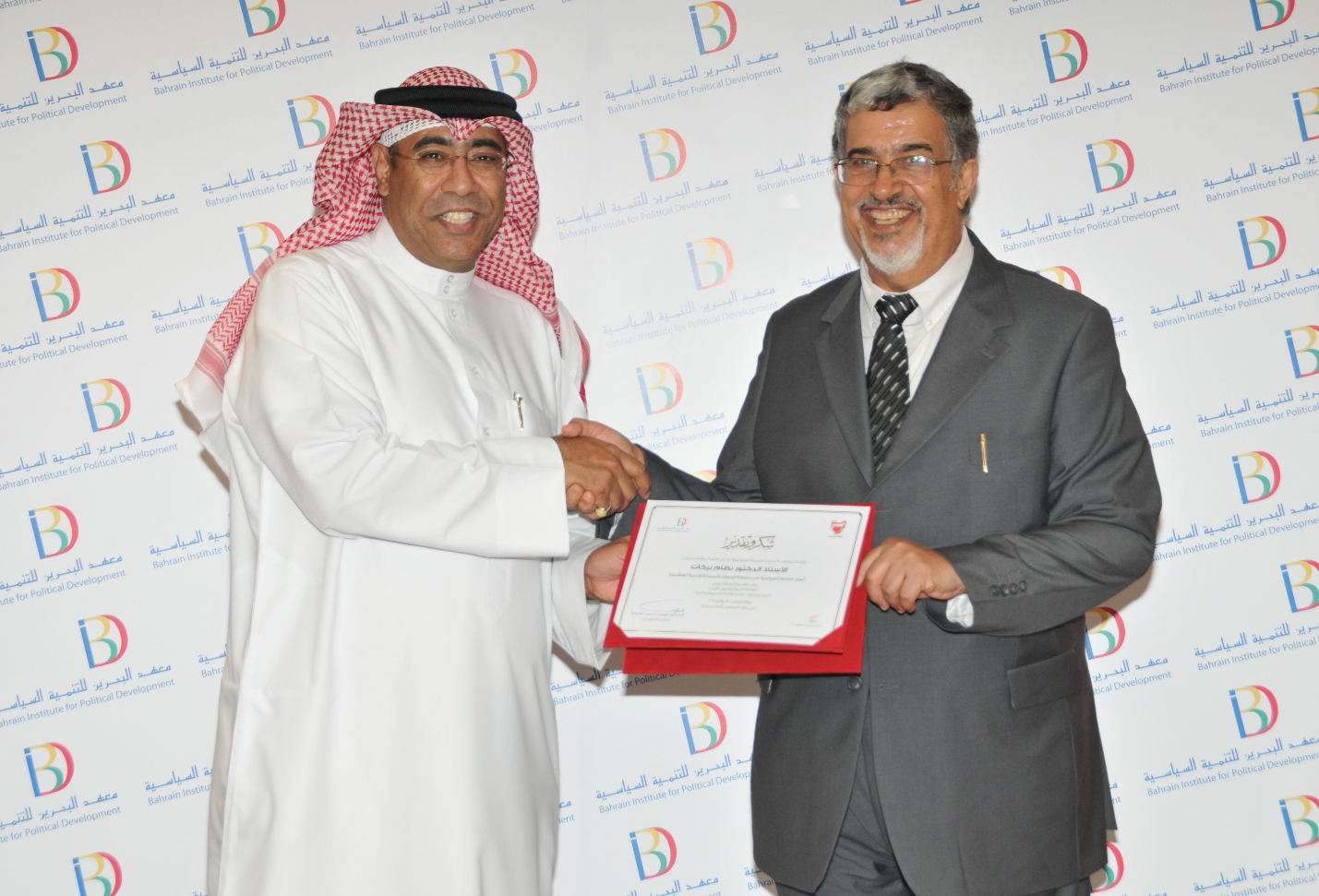 كرمت الإدارة التنفيذية لمعهد البحرين للتنمية السياسية المشاركين من مختلف فئات المجتمع البحريني في ورشة عمل "ثقافة الحوار وقبول الآخر"، وذلك بمنحهم شهادات مشاركة، تقديراً وعرفاناً من إدارة المعهد لدورهم في إنجاح ورشة العمل من خلال مشاركتهم الفاعلة. كما تم تكريم المحاضر أستاذ العلوم السياسية بجامعة اليرموك بالأردن الأستاذ الدكتور نظام بركات.