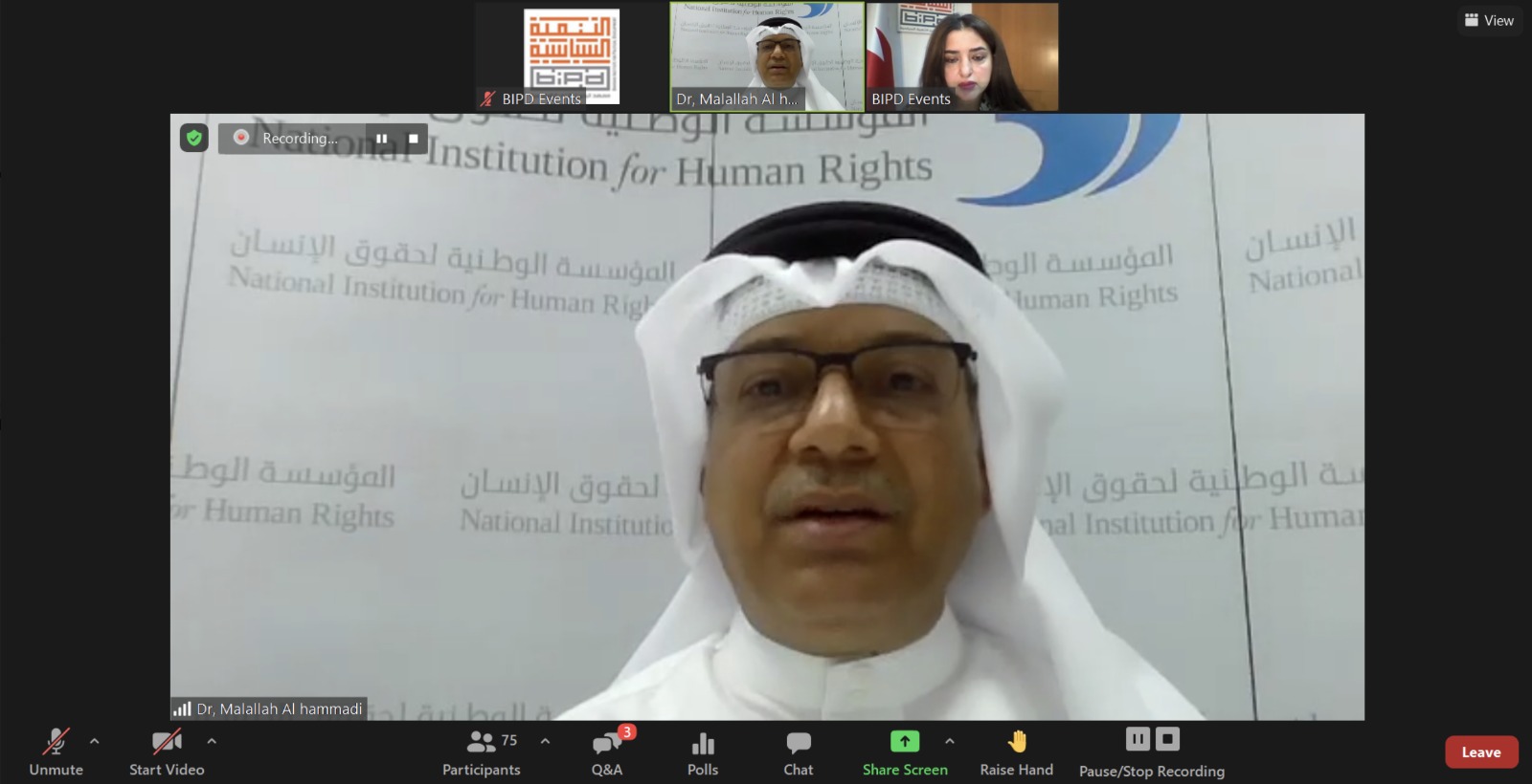 واختتم الدكتور الحمادي بالتأكيد على الدور الذي لعبته المؤسسة منذ إنشائها في مجال تعزيز وحماية حقوق الإنسان، سواء على المستوى التشريعي أو التخطيط الاستراتيجي لعملها أو التوعوي أو التثقيفي أو على صعيد رفع أي شبهة انتهاك أو مساس بأي من الحقوق المقررة في الدستور أو التشريعات الوطنية أو الصكوك والاتفاقيات الدولية والإقليمية ذات الصلة، وذلك كون المؤسسة آلية وطنية مستقلة ماليًا وإداريًا استقلالًا تامًا وتباشر مهامها في مجال تعزيز وحماية حقوق الإنسان وفقًا للمنظومة القانونية الوطنية لمملكة البحرين، مع الأخذ في الاعتبار على نحو رئيس المعايير الدولية والإقليمية ذات الصلة بحقوق الإنسان.