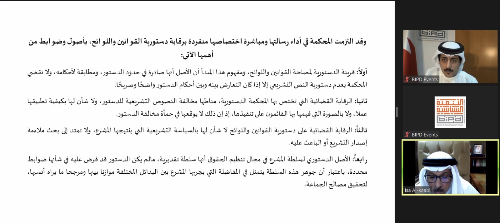 بمشاركة أكثر من 2000 مشاركًا في برنامج الوعي السياسي (3)؛ اختتم معهد البحرين للتنمية السياسية يوم أمس الأحد 13 يونيو الجاري؛ آخر فعاليات البرنامج بمحاضرة بعنوان "الرقابة على دستورية القوانين"؛ قدمها سعادة القاضي عيسى مبارك الكعبي عضو المحكمة الدستورية؛ عبر تقنية الاتصال المرئي عن بعد، والذي هدف المعهد من خلاله إلى تعزيز الانتماء الوطني وقيم المواطنة، ونشر ثقافة الحوار وتقبل الرأي الاخر، وتسليط الضوء على المتغيرات الوطنية ومواكبة الظروف الراهن.