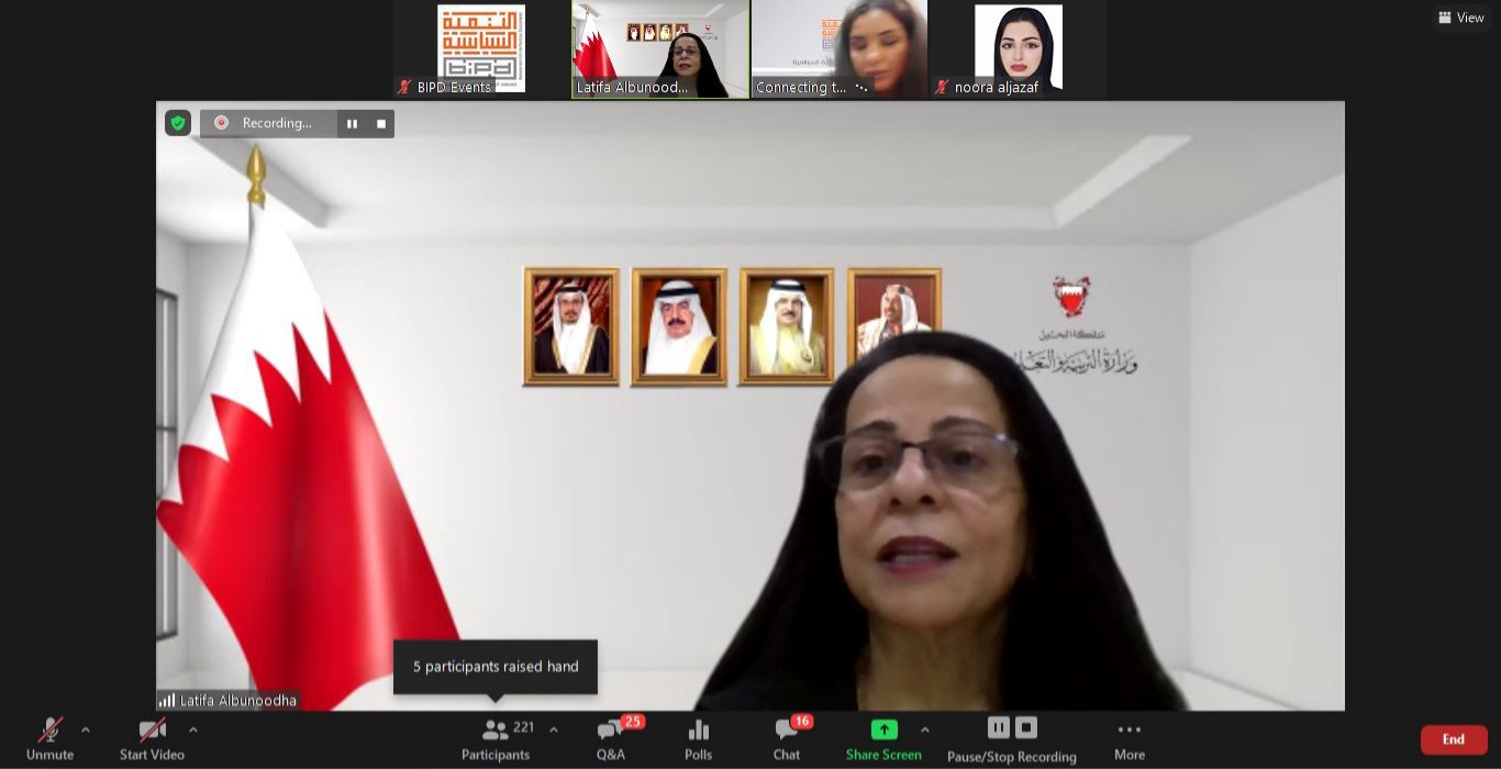 جاء ذلك خلال المحاضرة التي قدمتها البونوظة بعنوان (التعليم والتطوير.. من أجل مستقبل واعد)، يوم أمس الأحد؛ ضمن برنامج الوعي السياسي 3 الذي ينظمه معهد البحرين للتنمية السياسية، والذي يهدف إلى التعريف بأهمية المشاركة الإيجابية، والحقوق والواجبات كأساس للتطوير والتنمية، وترسيخ قيم المواطنة والانتماء الوطني وتقبل الرأي الآخر والحوار البناء تماشيًا مع المسيرة التنموية الشاملة لحضرة صاحب الجلالة الملك المفدى حفظه الله ورعاه.