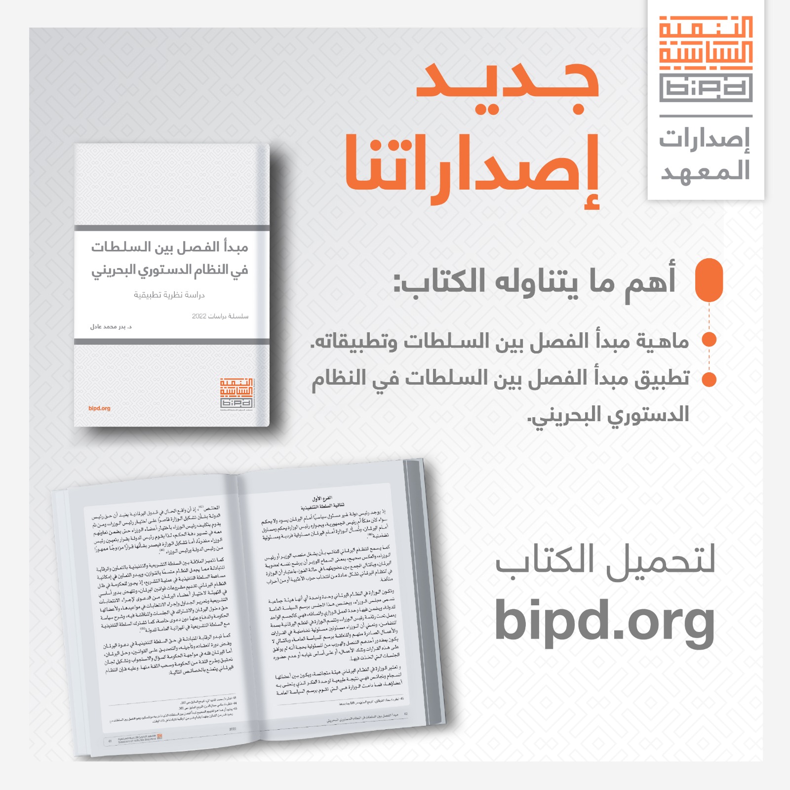 صدر عن معهد البحرين للتنمية السياسية كتاب، بعنوان "مبدأ الفصل بين السلطات في النظام الدستوري البحريني"، ضمن جهود المعهد في تعزيز البحث العلمي والدراسات المتخصصة في مختلف المجالات القانونية والدستورية والتشريعية، والهادفة إلى تعزيز الوعي والمعرفة لدى مختلف فئات المجتمع.