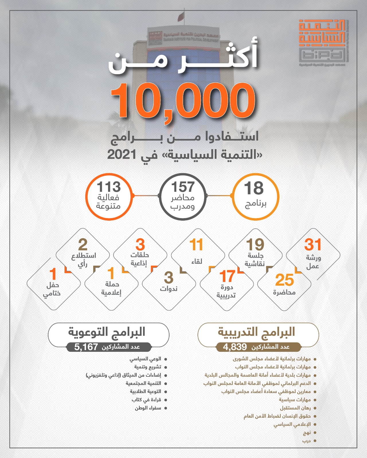 اختتم معهد البحرين للتنمية السياسية عام ٢٠٢١م، برامجه وفعالياته بنجاح كبير، حيث تمكن المعهد من الاستغلال الأمثل لتكنلوجيا الاتصالات الحديثة، حيث قام بتنفيذ 113 فعالية متنوعة، من خلال 18 برنامج، استفاد منها أكثر من 10 آلاف مشاركاً وقدمها 157 من الكفاءات الوطنية، إلى جانب إصدار مجموعة من الكتب والدراسات والأبحاث المعنية بتنمية وتعزيز قضايا التنمية السياسية، والمبادئ الأساسية للديمقراطية، وقضايا التحول الديمقراطي، إضافة إلى الكتب المتخصصة بالشؤون القانونية والتشريعية والدستورية.
