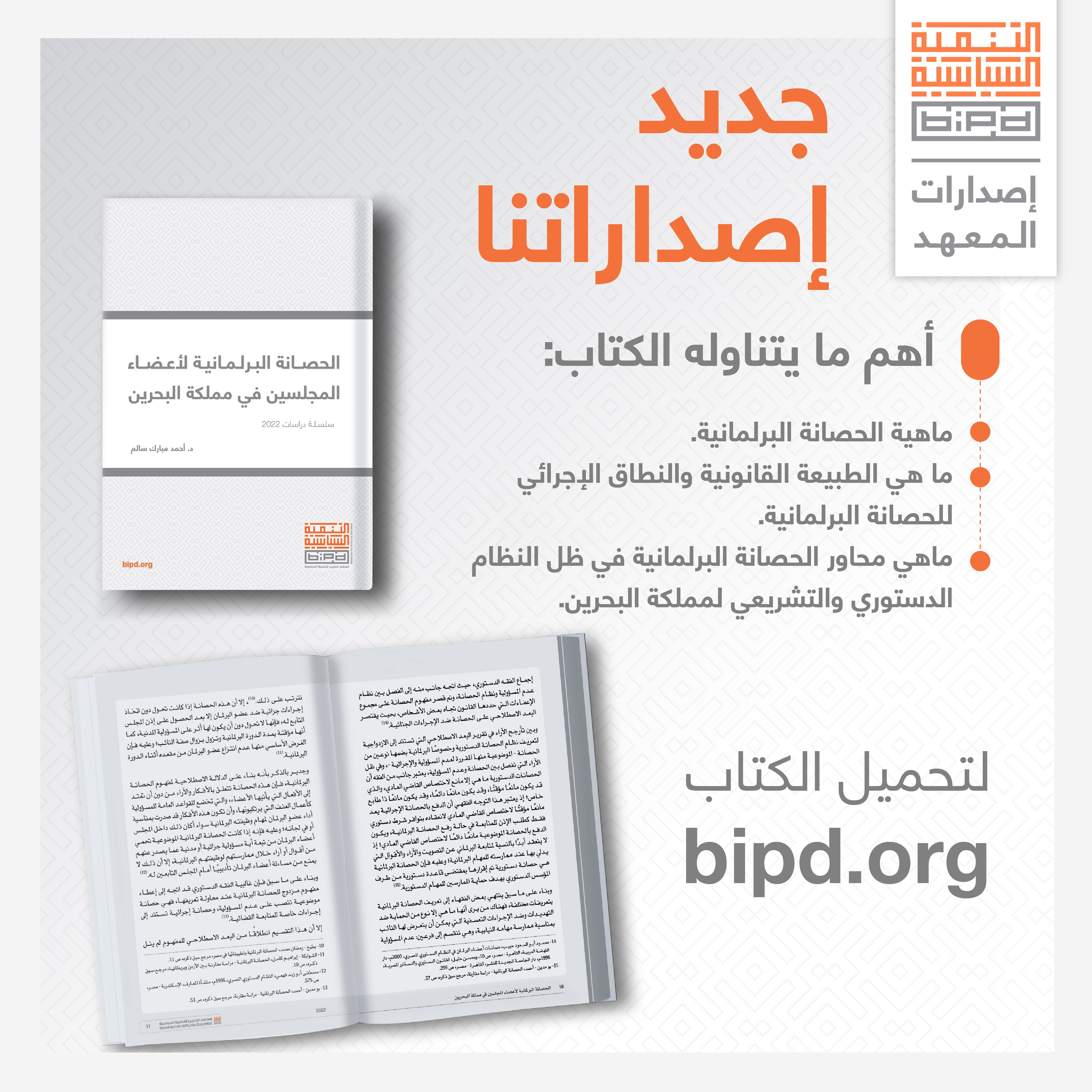 أصدر معهد البحرين للتنمية السياسية، ضمن سلسلة دراسات 2022، دراسة بحثية بعنوان "الحصانة البرلمانية لأعضاء المجلسين في مملكة البحرين"، تأليف الباحث الدكتور أحمد مبارك سالم.