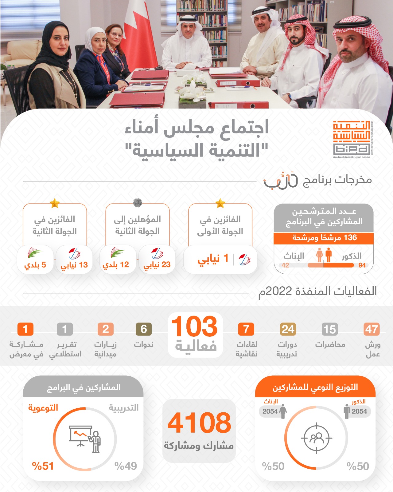 وأضاف رئيس مجلس الأمناء أن إجمالي عدد المشاركين في برامج المعهد المختلفة، والذي تم تنفيذها في الفترة من يناير إلى ديسمبر 2022، بلغ 4108 شخصًا من مختلف فئات المجتمع، منهم 50% من السيدات، بإجمالي 103 فعاليات مثلت البرامج التدريبية 49% فيما كان نصيب البرامج التوعوية 51%.