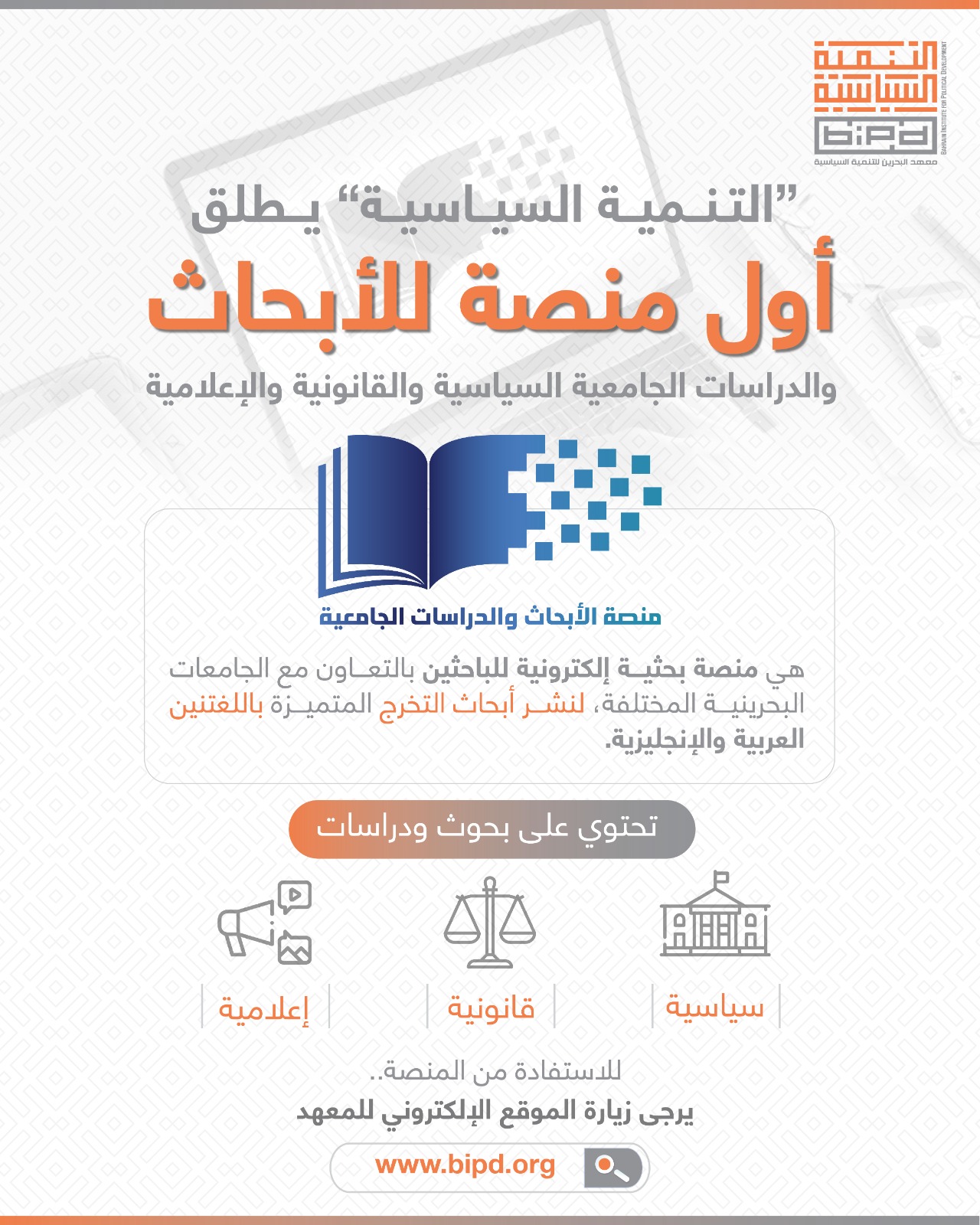 أعلن معهد البحرين للتنمية السياسية عن إطلاقه لأول منصة بحثية متخصصة من نوعها في مملكة البحرين وهي "منصة الأبحاث والدراسات الجامعية"، حيث تقدم البحوث المتعلقة بالتنمية السياسية في المملكة باللغتين العربية والإنجليزية، وذلك بالتعاون مع عدد من الجامعات البحرينية، و يمكن للجمهور الكريم المهتم الإطلاع على تلك الأبحاث عبر موقع المعهد bipd.org.