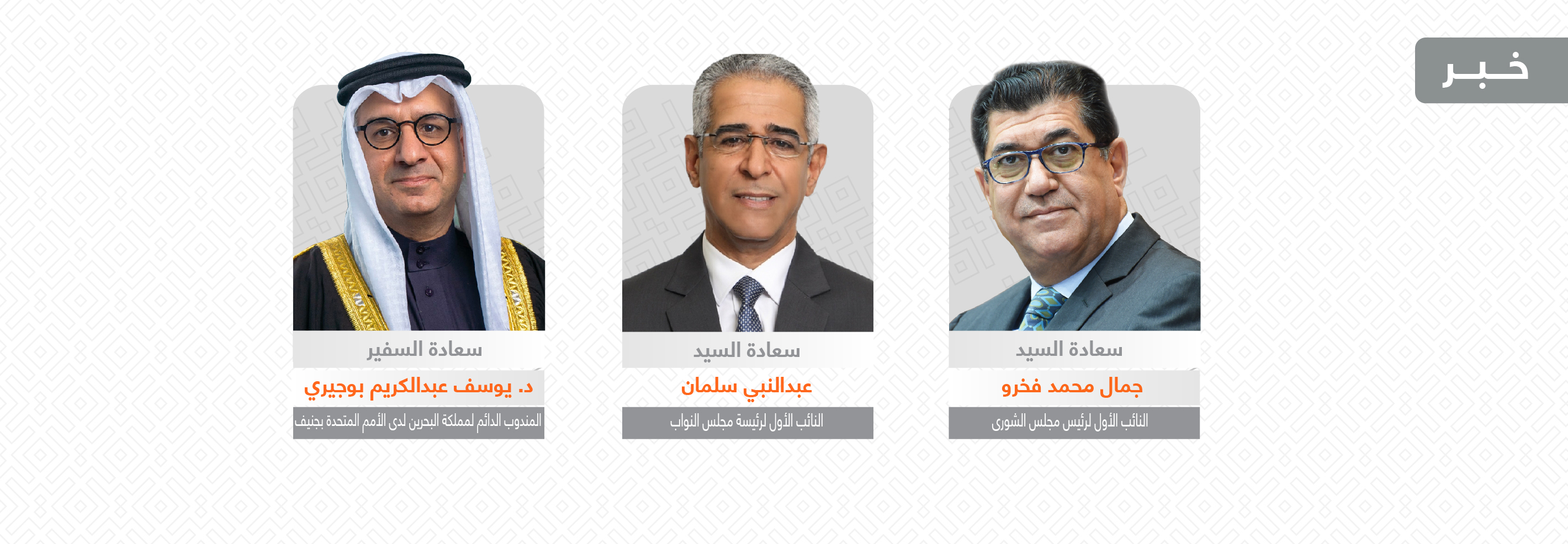 وسيشارك في الندوة كل من؛ السيد عبدالنبي سلمان النائب الأول لرئيسة مجلس النواب، والسيد جمال محمد فخرو، النائب الأول لرئيس مجلس الشورى، والدكتور يوسف عبدالكريم بوجيري، المندوب الدائم لمملكة البحرين لدى الأمم المتحدة في جنيف