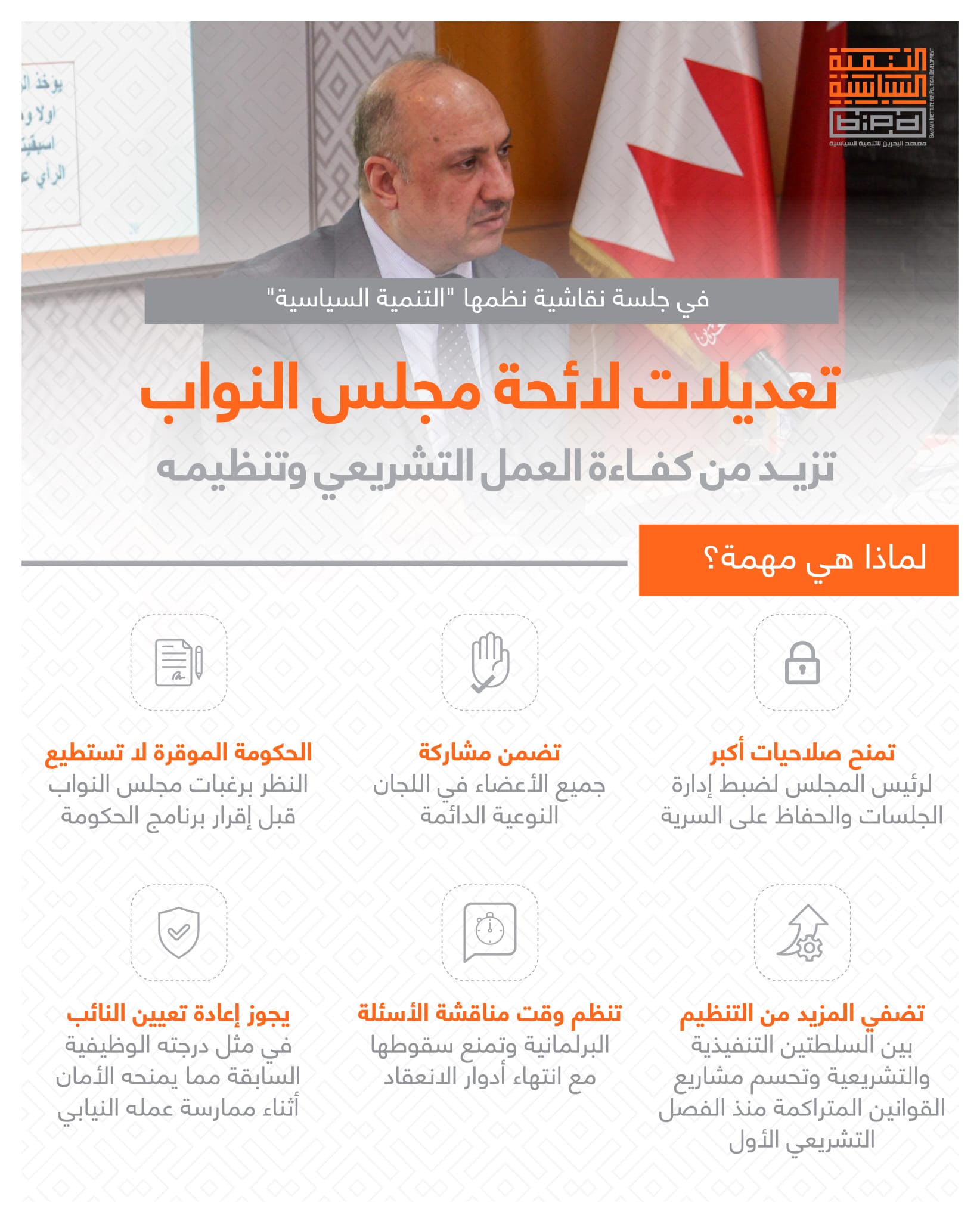 جاء ذلك خلال الجلسة النقاشية التي أقامها معهد البحرين للتنمية السياسية، أمس الأربعاء، لمناقشة التعديلات الصادرة بالمرسوم بقانون رقم (38) لسنة 2022 بتعديل بعض أحكام المرسوم بقانون رقم (54) لسنة 2002 بشأن اللائحة الداخلية لمجلس النواب، بحضور أعضاء مجلس الأمناء ونخبة من الأكاديميين والمهتمين.