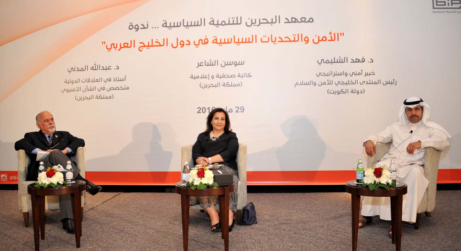 نظم معهد التنمية السياسية مساء أمس الأحد ندوة بعنوان (الأمن والتحديات السياسية في دول الخليج) وذلك في إطار دور المعهد التثقيفي من خلال نشر الوعي السياسي في المجتمع البحريني تحدث خلالها كل من الدكتور عبد الله المدني من مملكة البحرين أستاذ العلاقات الدولية والمتخصص في الشأن الاسيوي، والدكتور فهد الشليمي دولة الكويت خبير أمنى واستراتيجي رئيس المنتدى الخليجي للأمن والسلام، وأدار الندوة الاعلامية والكاتبة الصحفية سوسن الشاعر.